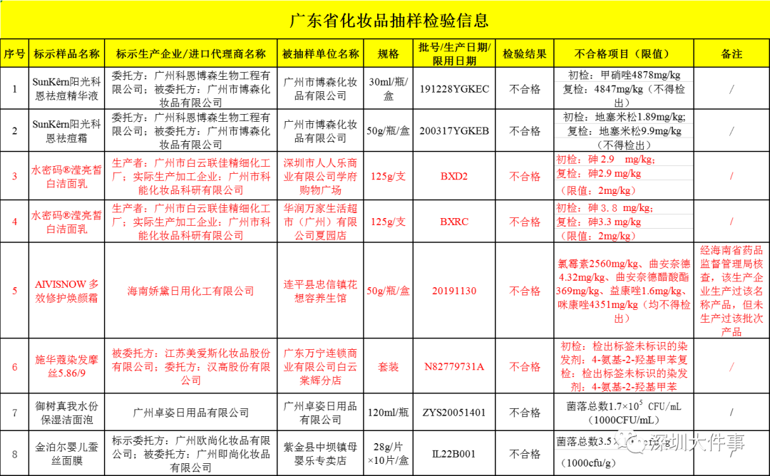 華潤萬家生活超市(廣州)有限公司夏園店銷售的、廣州市科能化妝品科研有限公司生產的水密碼 瀅亮皙白潔面乳,初檢砷含量為3.8 mg/kg,復檢砷含量為3.3 mg/kg。