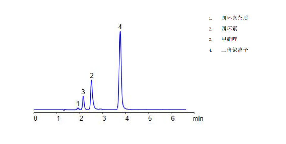 App ID: FLM-C250008 Comixsil HAX 對藥物制劑中三價鉍離子的HPLC-UV 法直接檢測 色譜柱:Comixsil HAX 3u 100*3.0mm(貨號:FMD-HAX3-YONU) 流速:0.5 mL/min 檢測:260nm 樣品濃度:1 mg/mL 進樣量:5 μ 溶劑:水 流動相:乙腈:水:100mM 甲酸銨(pH4.1,含0.04mg/ml EDTA)=7:78:15