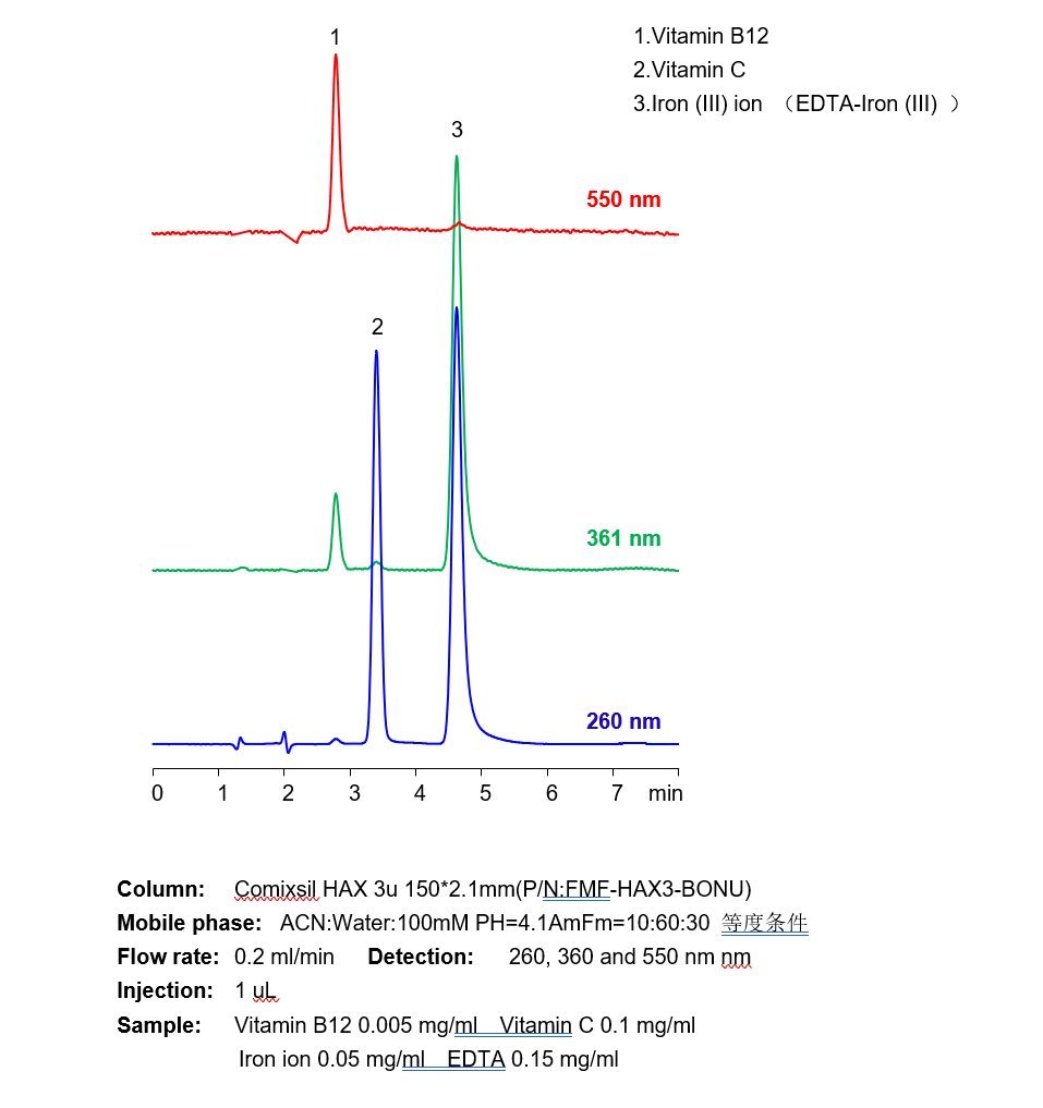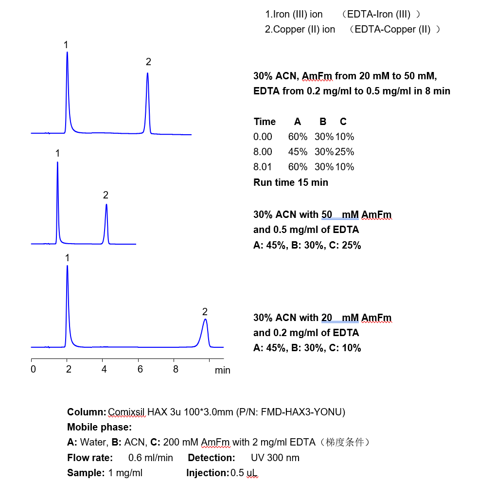 三價(jià)鐵離子等三價(jià)金屬離子,在硅膠基質(zhì)的色譜柱中極易死吸附,從而損壞色譜柱,在液相直接檢測(cè)中存在較大難度。 本方法研究三價(jià)鐵離子與EDTA形成紫外可見的強(qiáng)吸收絡(luò)合物,再通過Comixsil HAX色譜柱保留。通過對(duì)絡(luò)合物的定量從而定量三價(jià)鐵離子等三價(jià)金屬離子。 應(yīng)用一:三價(jià)鐵離子的檢測(cè) 方法A、三價(jià)鐵離子流動(dòng)相中與EDTA絡(luò)合