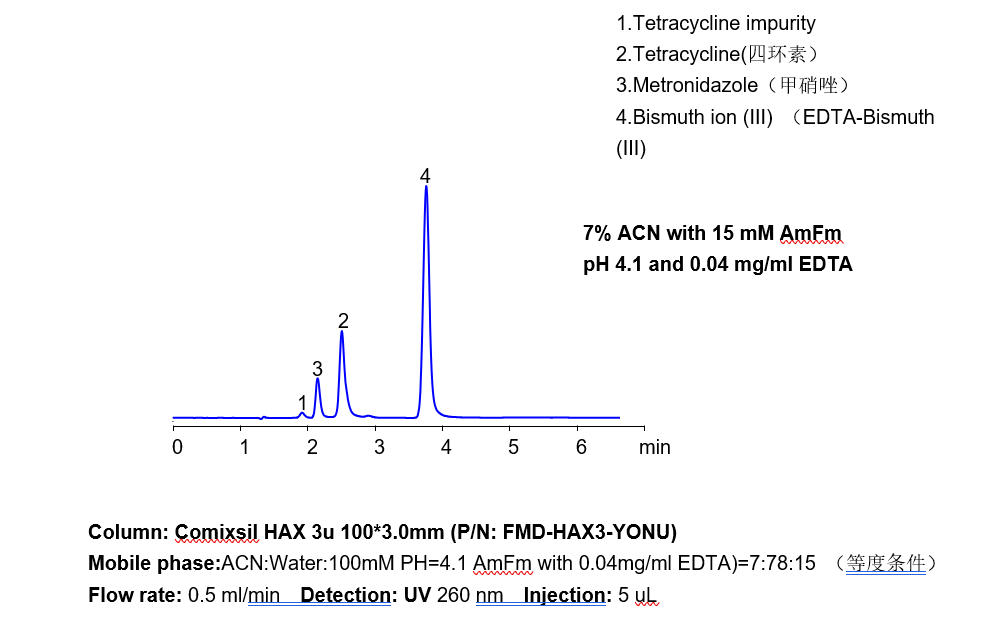 總結(jié): 綜上,方法A,B,C的關(guān)于三價(jià)鐵離子(二價(jià)鐵離子)與三價(jià)鉍離子,在藥物制劑,保健品,藥物殘留中的應(yīng)用。我們可以了解到,采用流動(dòng)相中加EDTA,或者樣品配置時(shí)加EDTA(可避免流動(dòng)相中加EDTA),使三價(jià)金屬離子與EDTA絡(luò)合合,基于Comixsil HAX智能混合柱對(duì)此絡(luò)合物的保留,UV的可視化,可以用簡(jiǎn)單的HPLC+UV的方法來檢測(cè)定三價(jià)離子(以上方法C中,客戶實(shí)際上也自行開發(fā)了樣品配置時(shí)加EDTA的方法)。同時(shí),方法的實(shí)際優(yōu)化過程中,EDTA的濃度與甲酸銨的濃度,會(huì)影響金屬離子絡(luò)合物的保留,峰形以及UV響應(yīng)值。這些因素是需要根據(jù)不同實(shí)際樣品而進(jìn)行調(diào)整的。 小知識(shí)點(diǎn):用過EDTA系統(tǒng)的清洗 在HPLC方法中,EDTA是能不使用則不使用的,然后它的特殊性,在一些傳統(tǒng)的老品種,老藥典方法中仍然存在。有很多關(guān)于用過EDTA的儀器,管路,如何清洗的問題。在此分享如下: 1.要使用EDTA時(shí),管路盡可能用PEEK管; 2.懷疑或擔(dān)心EDTA殘留,要清洗儀器與金屬管路時(shí),可以用100%的50mM CuSO4水溶液先沖洗管路1小時(shí),再用0.2%-0.3%的硫酸水溶液清洗30分鐘,最后再用水清洗10分鐘左右即可。