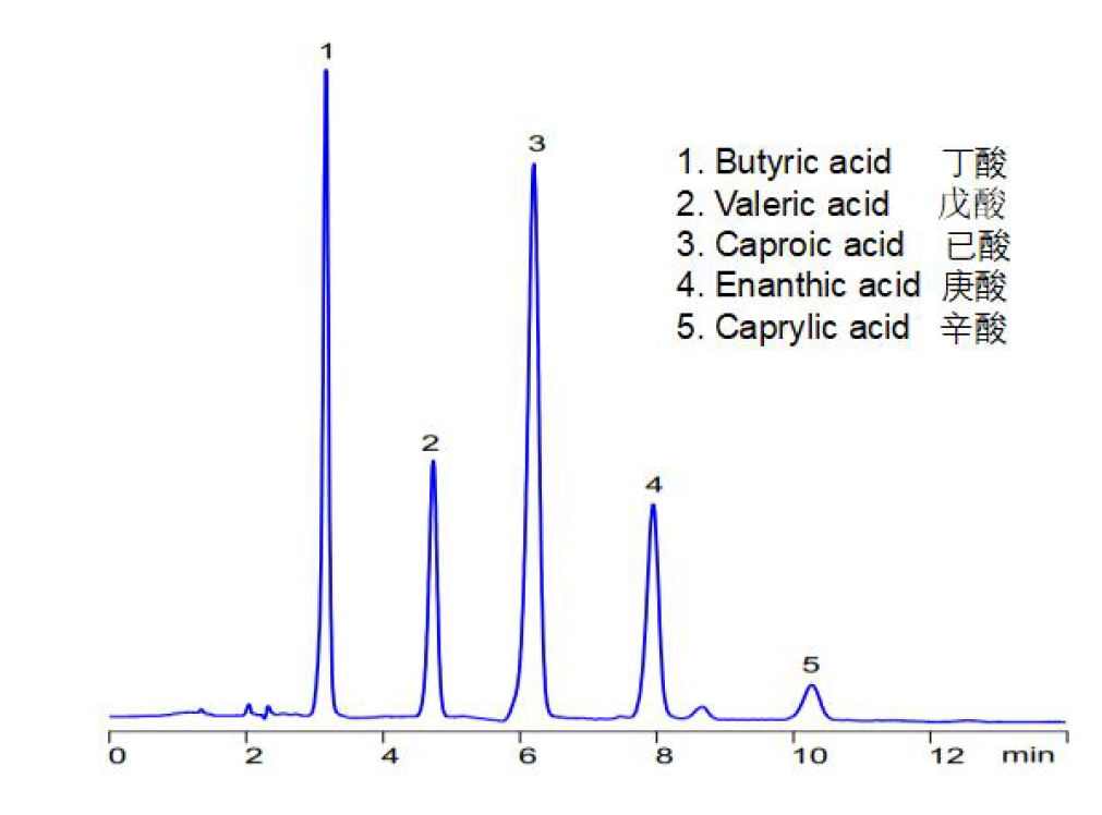 App ID: FLM-C250012 Comixsil RP-100 HPLC-UV 法直接分析有機酸-丁酸戊酸已酸庚酸辛酸 色譜柱:Comixsil RP-100 3μ 150x4.6mm 貨號:FMF-100R3-EONU 流速:1mL/min 檢測:UV 210nm 柱溫:25℃ 進樣量:5μL 流動相:乙腈:水:硫酸(20%:75%:5%) 色譜圖: